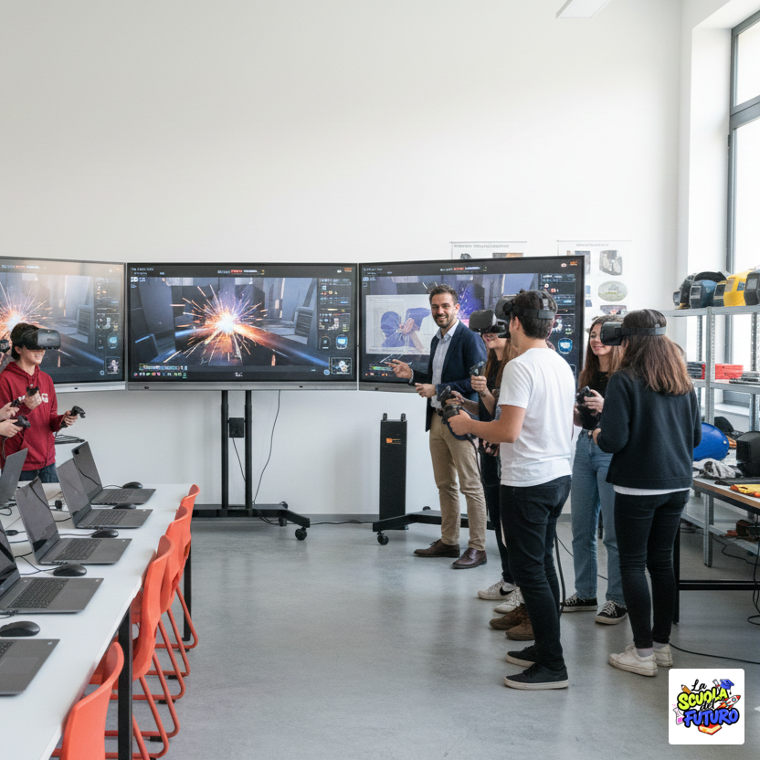 Un ambiente di apprendimento evoluto è stato progettato per potenziare l’istruzione tecnico-professionale nelle tecniche di saldatura avanzata e nell’analisi dei difetti. Questa dotazione aumenta il numero di visori per la simulazione e introduce una zona di visualizzazione interattiva, equipaggiata con monitor touch di ampie dimensioni. Questo spazio è ideale per l’analisi collaborativa delle simulazioni, la valutazione della qualità delle giunzioni e la risoluzione di problemi procedurali, promuovendo il lavoro di squadra e la capacità di dibattito e negoziazione tra studenti sulle migliori prassi operative. L’area informatica potenziata con un maggior numero di notebook è fondamentale per l’analisi dettagliata dei parametri di saldatura. Gli allievi affinano la padronanza del public speaking e sviluppano le competenze trasversali necessarie per la gestione operativa e l’esposizione di standard qualitativi elevati nel settore.